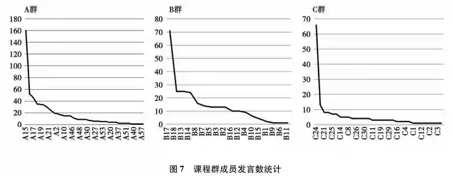 A群共有成员73人,参与讨论62人,发言率84.9%,发言数前20%的成员发言率占64%;B群共有成员19人,18人参与了讨论,发言率94.7%,发言数前20%的人发言数占56%;C群共有成员50人,32人参与了讨论,发言率64%,发言数前20%的人发言数占64%(图7)。