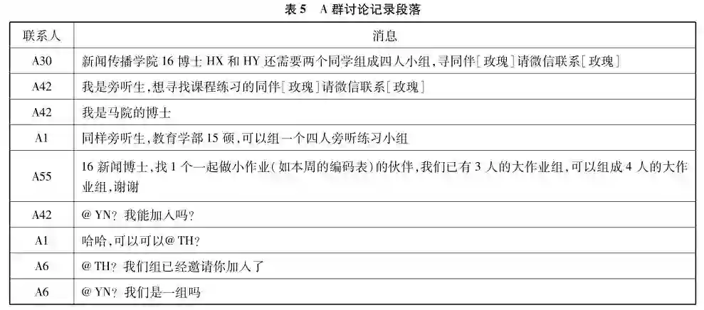 观察发现,随着交流的深入,尤其课程任务出现以后,学习者会在大群中自发组成小组,并建立子群。A群交流记录与最终的分组结果(最终分组结果标注专业与姓名,并在课程群与公共邮箱中公布)显示,学习者倾向于跟自己不同专业、不同性别的学习者组成协作小组。在A群中,根据课程要求两人组成小组共同完成课外阅读并进行讨论,3-5人组成大组开展项目研究并完成研究报告,在教务信息发布后,课程群就展开了讨论并在下次上课前完成分组(表5)。