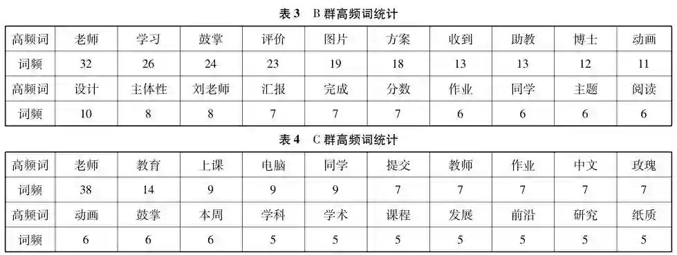 三个课程群中“教师”“助教”“作业”“上课”“提交”等教务相关信息均出现频率较高;“图片”“玫瑰”“动画”“流泪”“鼓掌”等表情符号也被经常使用。A群中与课程内容直接相关的“数据”“变量”“问卷”“分析”“编码”“问题”等关键词也有较高的出现频率,但B群与C群中几乎没有出现与课程内容直接相关的高频词。