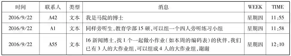 本研究选取“SPSS课程群”“教育技术学科前沿研究课程群”“教育学科前沿发展课程群”三个微信群作为研究对象。三个群均为研究生一年级课程学习交流群,课程均采用传统课堂面授的方式进行,群成员有一定的交叉。