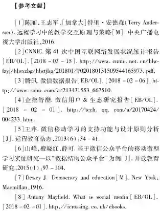 教学交互是教学的重要组成部分[7],是学习者与学习环境相互交流和相互作用而追求自身发展的过程。远程学习中的教学交互是教与学再度整合的过程,决定了学习是否发生及发生的水平[1]。媒体在非面对面的学习情境中至关重要,关乎交互的水平与质量。社交媒体具有参与、公开、交流、对话、社区化、连通性等特征[8],可以把图片、视频、文本和传统内容进行混搭处理并进行互动,建立“联系”和生成“意义”[9],在教育教学中的应用场景日益多样化。已有研究表明,基于社交媒体可以构建网络学习共同体[10-11]、调动学习者的积极性、提高学习效果,较BBS、BLOG等工具,学习者之间沟通更加方便[12-13]。不同社交媒体的交互性不同,对教学交互的支持也有差别[14]。微信已成为我国用户最多的社交媒体,被广泛地应用于教育领域,有不少学者对其教育应用进行了相关研究。通过文献研究发现,主要包括微信、微信群交互性的研究及基于微信、微信群或公众平台教学设计与实施的研究两大类。