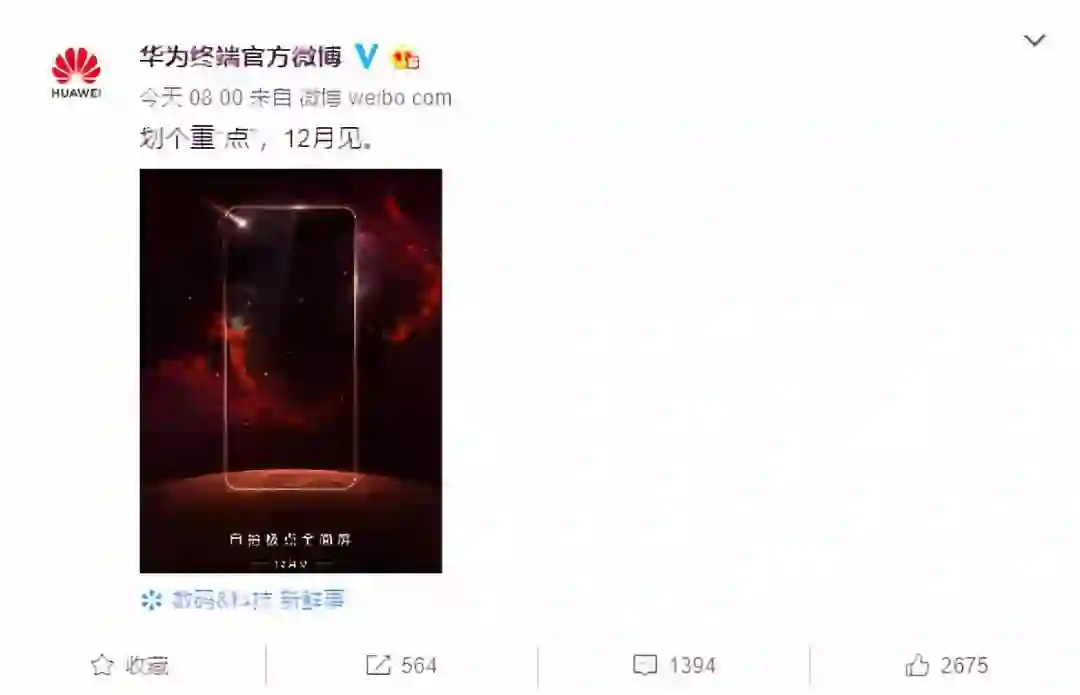 华为终端官方微博预告将于12月份发布新机,该机可能是华为nova系列新品,或将被命名为nova 4。