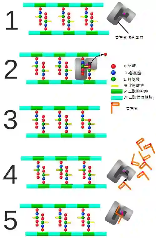 图8 PBPs在细菌细胞壁生成交联中发挥作用及其与青霉素等结合产生永久抑制的作用1~3为转肽酶正常作用时对肽聚糖的催化联结作用;4~5则是青霉素抑制转肽酶后,肽聚糖片段无法联结的情况