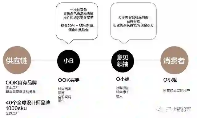 目前国内饰品渠道以线下小店或商场品牌为主,供应链分散,缺乏本土品牌,价格两极化严重,缺乏中高端定价。OOK切中市场缺口,聚集40个全球设计师品牌并逐步整合全球设计师资源建立自有品牌进行供应链建设,通过时尚商家、网商和个体组成的买手小b端进行直销,以社群领袖、时尚博主和达人进行多渠道流量收敛,并不断转化消费者成为意见领袖和小b端。同时,OOK打通线上线下渠道,以OOK为供应链平台,向APP、微信、微博、各大电商以及线下快闪店进行多端口对接,形成从生产、供应链到销售的闭环,不断赋能和扩大小b端,形成良性分销生态圈。