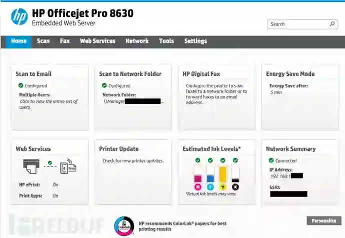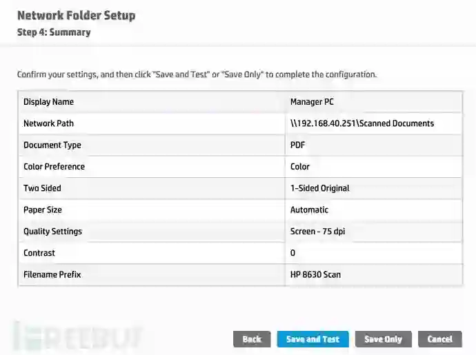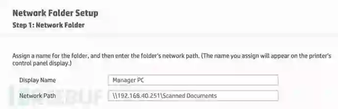 在网络上这个打印机被配置为,扫描和保存文档到单独的计算机工作组中。另外我发现它的配置文件可被随意编辑更改,而不需要任何的权限认证。