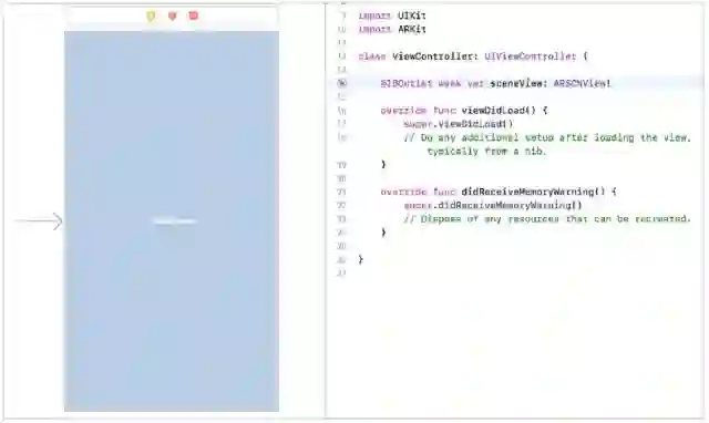 我们仍然在Main.storyboard文件。进入工具栏,打开助手编辑器。在ViewController.swift文件顶部添加导入语句以导入ARKit: