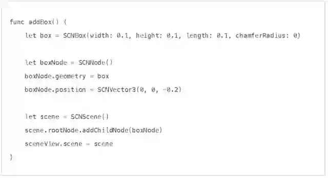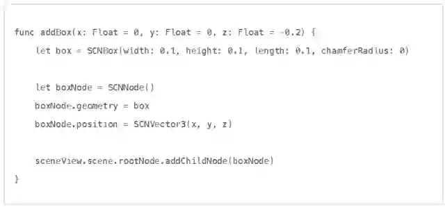 然后我们创建一个场景。这是要在视图中显示的SceneKit场景。然后我们将盒子节点添加到场景的根节点。场景中的根节点定义了由SceneKit呈现的现实世界的坐标系。