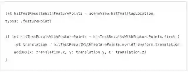 参数指定一个结果类型。该types参数要求命中测试搜索通过AR会话处理相机图像检测到的真实世界对像或曲面。结果类型有很多种类型。但是,我们将仅关注本教程中的特征。