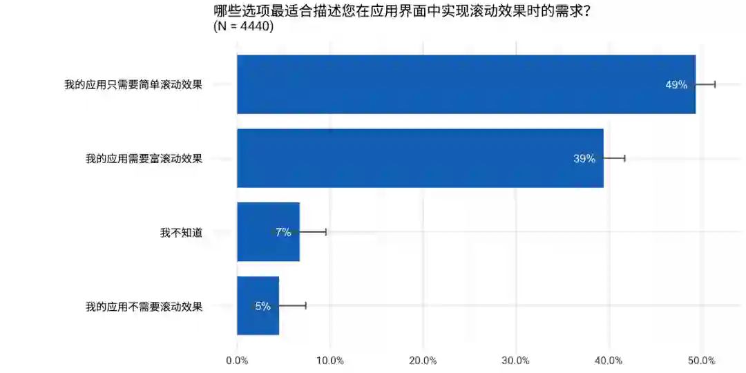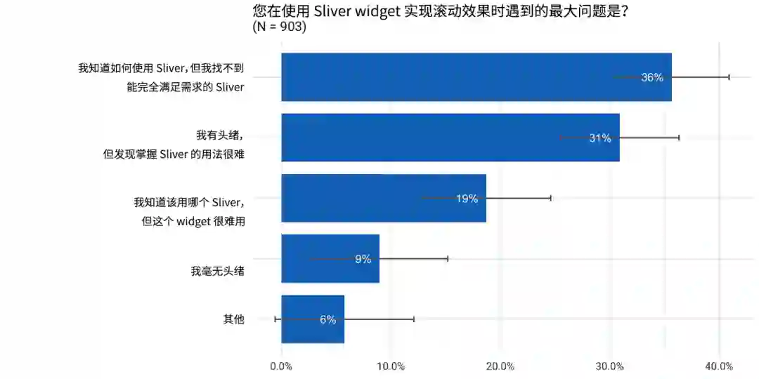 在想用 Sliver 实现丰富滚动效果的用户中,有 79% 实际进行了尝试。最大的问题是难以找到符合需求的 widget (36%)。