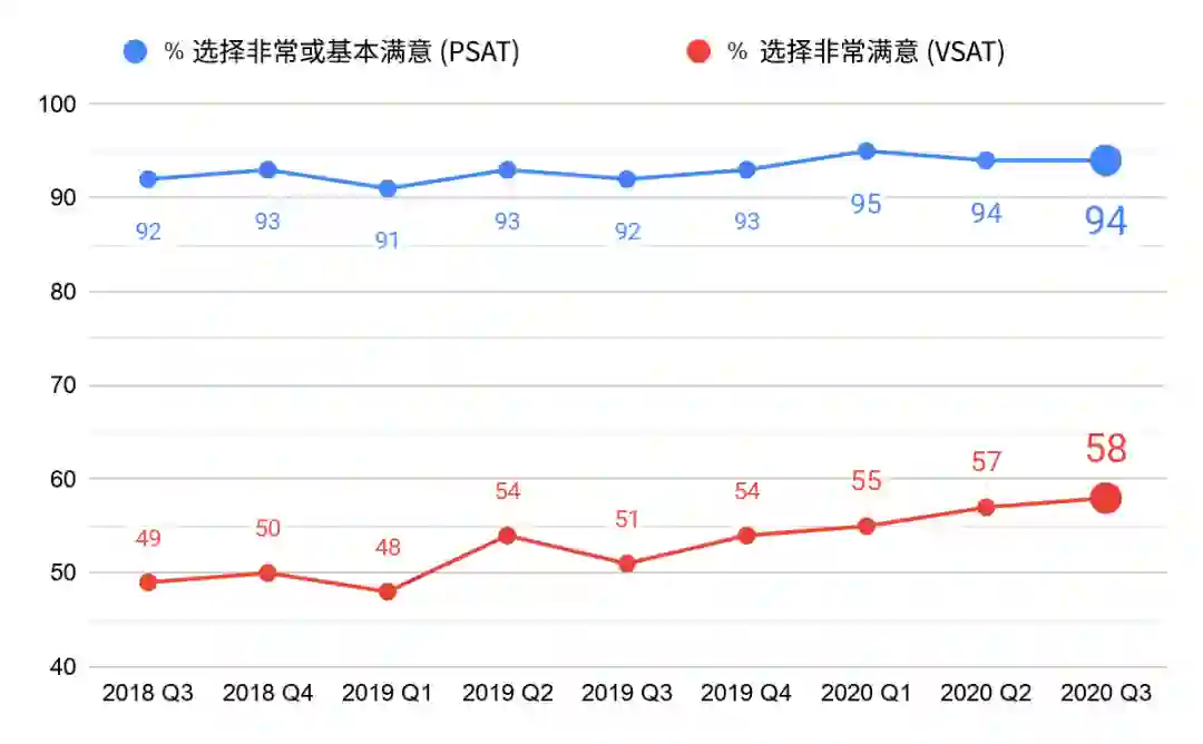 总体而言,94% 的受访者对 Flutter 表示满意 (PSAT),58% 的受访者表示非常满意 (VSAT)。PSAT 保持稳定,VSAT 持续增长。