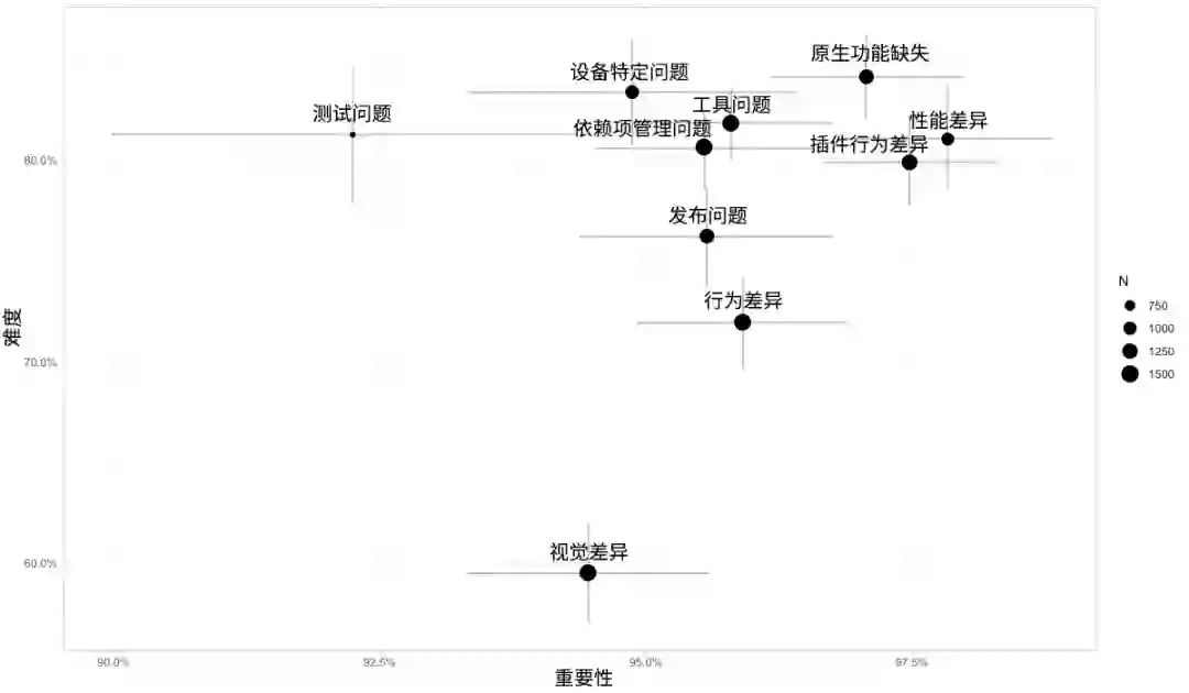 受访者还对其调试的每个问题的重要性和难度进行了评估。最重要的调试问题是缺失原生功能、性能差异、行为差异、插件行为差异和发布问题。最困难的调试问题是缺失原生功能、设备特定问题、性能差异、依赖项管理和工具问题。