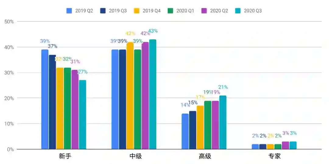 另一个明显变化是对 Flutter 的使用经验。如下图所示,新手用户的比例随时间下降,而高级用户的比例随时间增加。这意味着我们在社区中拥有更多经验丰富的用户,这些用户可以与新手用户分享知识。如果您喜欢学习或分享知识,欢迎与其他 Flutter 开发者在线沟通: 访问 flutter.dev 上的社区汇总页面即可加入您感兴趣的社区。