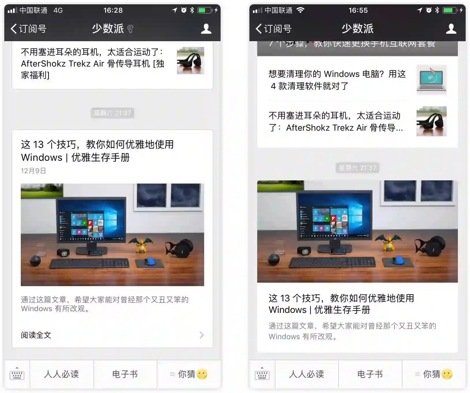 在老版本的微信里,我们看到的微信公众号发出的内容卡片都是带着「黑色边框的圆角矩形」,在灰色的背景可能各位的显眼。新的卡片样式使用类似于 App Store 的阴影卡片,并且优化了文字的排版,更加符合 iOS 11 的设计趋势,整体滑动浏览的时候给用户的感觉更加的融合了。