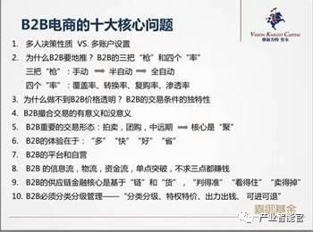 从更广范围的角度对to B进行分类,可以分为两大类,我们在座的无非是两大类中的一类。一类是叫做交易型B2B。在座的很多有做市场的,包括买家和卖家,这种就是交易型的。另外一类是服务型B2B。这类并没有一个像交易市场这样的平台,而是通过企业对企业提供服务。这十个核心问题对交易型的百分之百都适用,对服务型的60%也适用也就是十条中有六条也是适合于服务型企业的。我们每个企业对号入座,先把自己归个类。