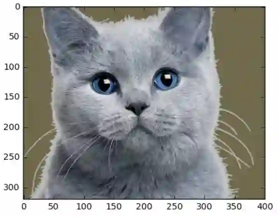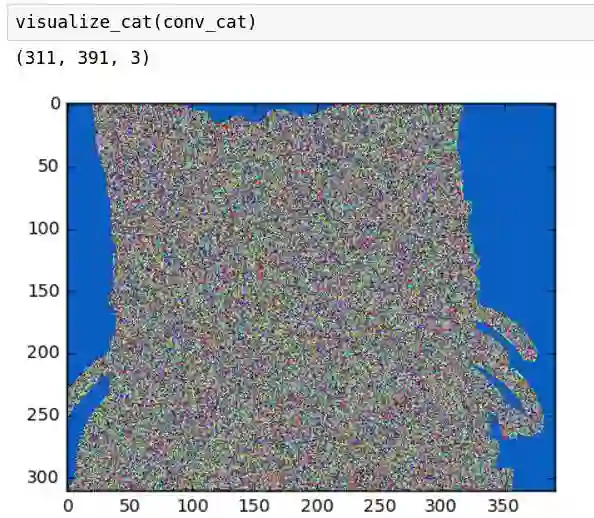这张看起来好多了!现在我们可以看到我们的过滤器看到的一些事情。看起来红色替换掉了黑色的鼻子和黑色眼睛,蓝色替换掉了猫边界的浅灰色。我们可以开始看到图层如何捕获照片中的一些更重要的细节。