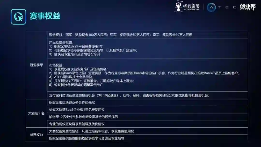 此外,蚂蚁区块链创新大赛为参赛者提供了极为丰厚的权益。其中,总奖金额高达180万元,冠军奖金为100万元,亚军奖金为50万元,季军奖金为30万元。同时,大赛期间涌现的优秀企业有机会获得蚂蚁金服提供的10亿支付宝科技创新基金支持。