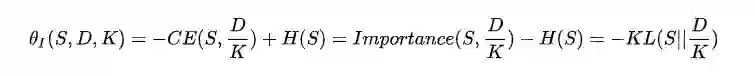 论文在理论部分的最后还提到了一个概念叫potential information。这个概念的目标主要是为建模informativeness目标提供上界。具体来说,potential information 建模的是D与K的分布差异。简单来说就是在背景知识K的条件下,我们能从D获取的新的信息量。其同样使用交叉熵来建模两个分布的差异,公式如下: