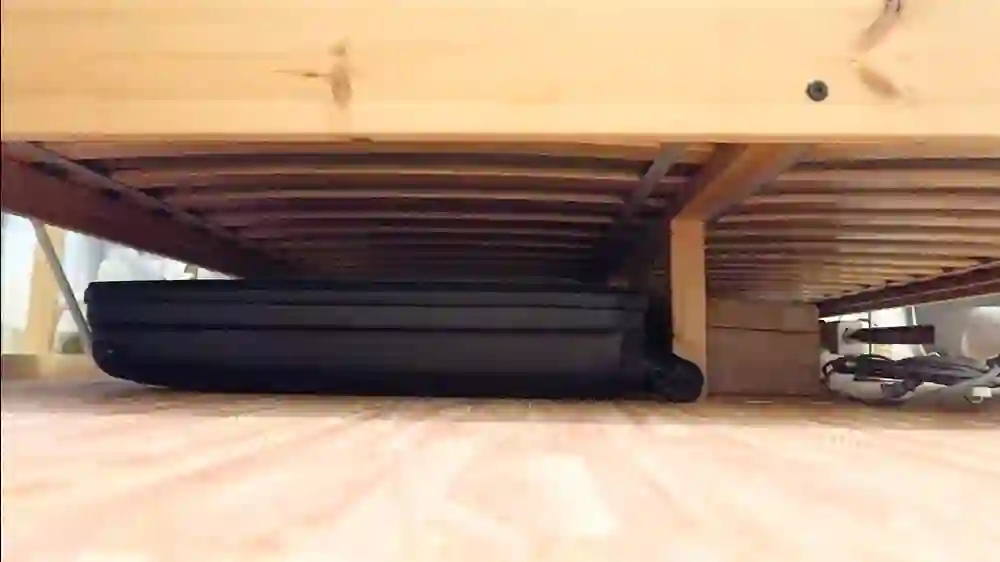 床底:敞开的行李箱(里面放了用压缩袋装起来的衣服)、前几天买的鞋子的盒子、手持吸尘器