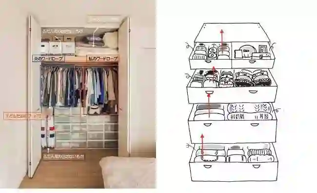左:用抽屉柜整理重新安排衣橱内的空间;右:符合垂直取用原则的物品摆放方法(图源:《怦然心动的人生整理魔法》)