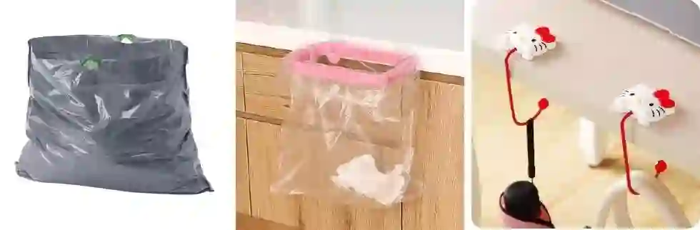 左:抽绳式垃圾袋;中:吸盘式垃圾架;右:桌边挂钩