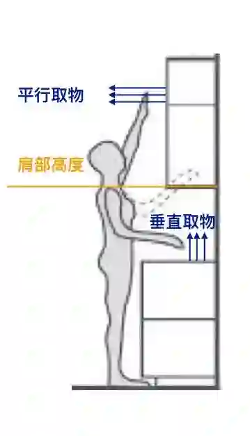 如果存放位置比肩部低,取用方向应与地面垂直(把所有低于肩膀的收纳空间都当作抽屉来存放物品)