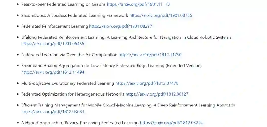 【导读】 联邦学习(Federated Learning)是一种新兴的人工智能基础技术,在 2016 年由谷歌最先提出,原本用于解决安卓手机终端用户在本地更新模型的问题,其设计目标是在保障大数据交换时的信息安全、保护终端数据和个人数据隐私、保证合法合规的前提下,在多参与方或多计算结点之间开展高效率的机器学习。其中,联邦学习可使用的机器学习算法不局限于神经网络,还包括随机森林等重要算法。联邦学习有望成为下一代人工智能协同算法和协作网络的基础awesome