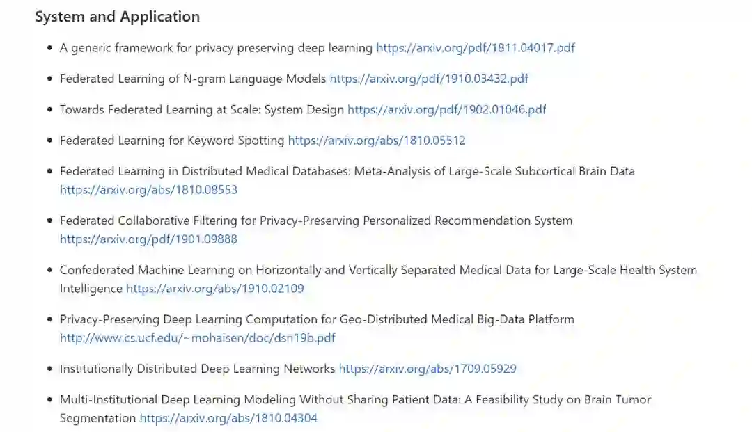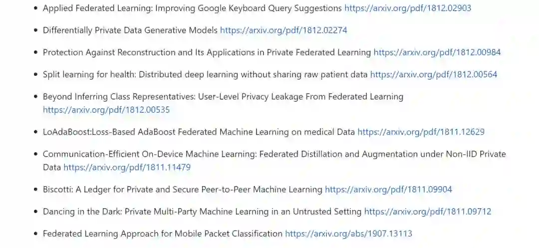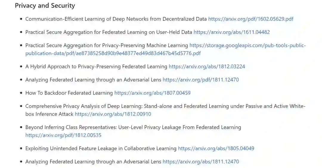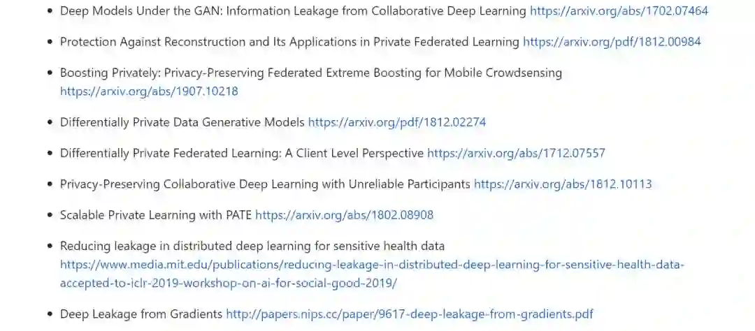 本资源整理了与机器学习中的联合学习和隐私相关的资源列表。包括相关论文、代码以及案例。