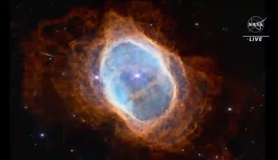 2、南环星云(Southern Ring Nebula),又称八裂星云,距离地球约2000光年,位于船帆座方位。这是一个行星状星云,是由类似太阳的恒星死亡后喷发的物质形成的环状结构。中心区域有一颗白矮星,温度可达10万度,它发出的紫外线激发了周围气体发光。