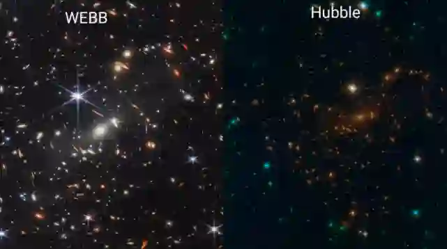 此前,哈勃望远镜在同样的区域也拍摄过一张宇宙深场照片,两者对比可以看出清晰度差别很大。但要注意的是,哈勃的深场照片主要是在可见光下拍摄的,另加一小部分近红外,而韦伯完全是在近红外线下拍摄的。