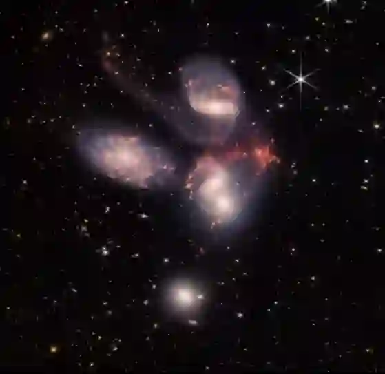 4、斯蒂芬五重星系 (Stephan's Quintet)是一个星系群,看上去是由五个星系构成,但其中只有四个星系靠得比较近,存在显著的引力相互作用,构成真正的星系群,观测表明,它们正在发生合并。这个五重星系最早是由法国天文学家Édouard Stephan发现的,因此命名为斯蒂芬五重星系。