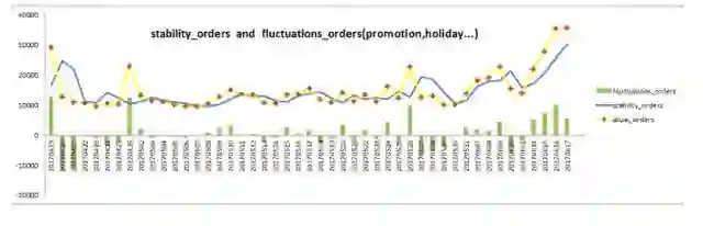 对促销、流量等数据进行分析,抽取与销量波动相关的特征变量,将不同的特征变量带入同一有效的模型逐步验证特征变量的有效性;再将相同的特征变量应用到不同的模型中以测试不同模型的效果,并选择效果最佳的特征变量和模型作为销量预测模型。例如:我们选取了一些典型的SKU,对其促销活动数据和发货量数据作分析,发现发货量的异常波动和促销活动之间有极大的相关性。