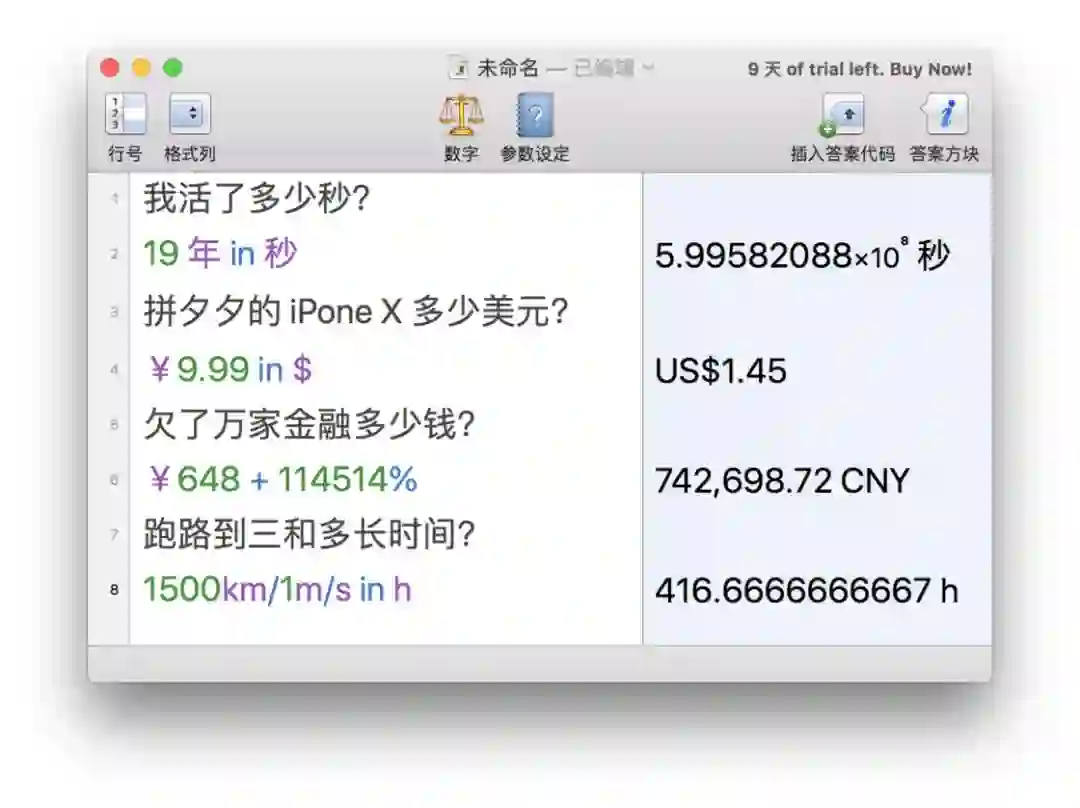 Soulver 是一款科学计算器,与 PCalc 等同类应用不同的是,Soulver 可以「听懂你说的话」。只需要以近乎自然语言的方式敲出算式,你就可以在 Soulver 的右侧界面实时获取答案。Soulver 支持时间、长度、货币、函数等多种类型计算,尽管未完全适配中文,但其英文语法也足够简单。