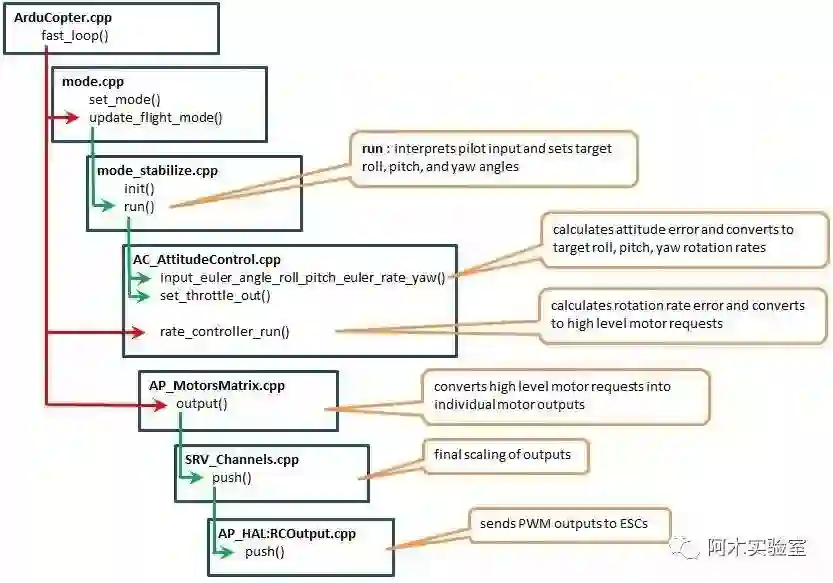 ●调用顶层flight-mode.cpp的“update_flight_mode()”函数。此函数检查飞行器的飞行模式(即“control_mode”变量),然后调用适当的<飞行模式> _run()函数(如 stabilize_run 为稳定模式, rtl_run 为一键返航模式,等等)。<flight mode> _run()函数可以在适当命名的control_ <flighttype> .cpp文件(即 control_stabilize.cpp, control_rtl.cpp等)中找到。