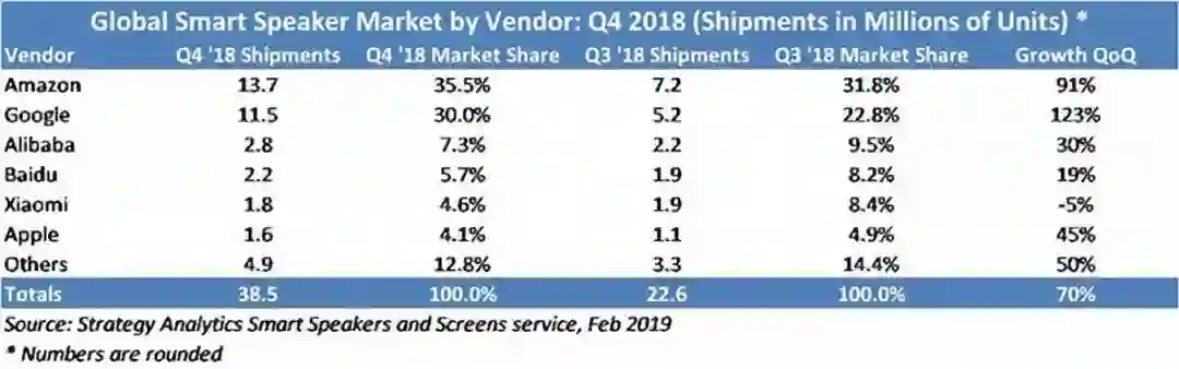相比之下,亚马逊和谷歌在2018年第四季度的智能扬声器出货量分别为1370万台和1150万台,这两家公司在该季度的市场份额达到了65.5%。
