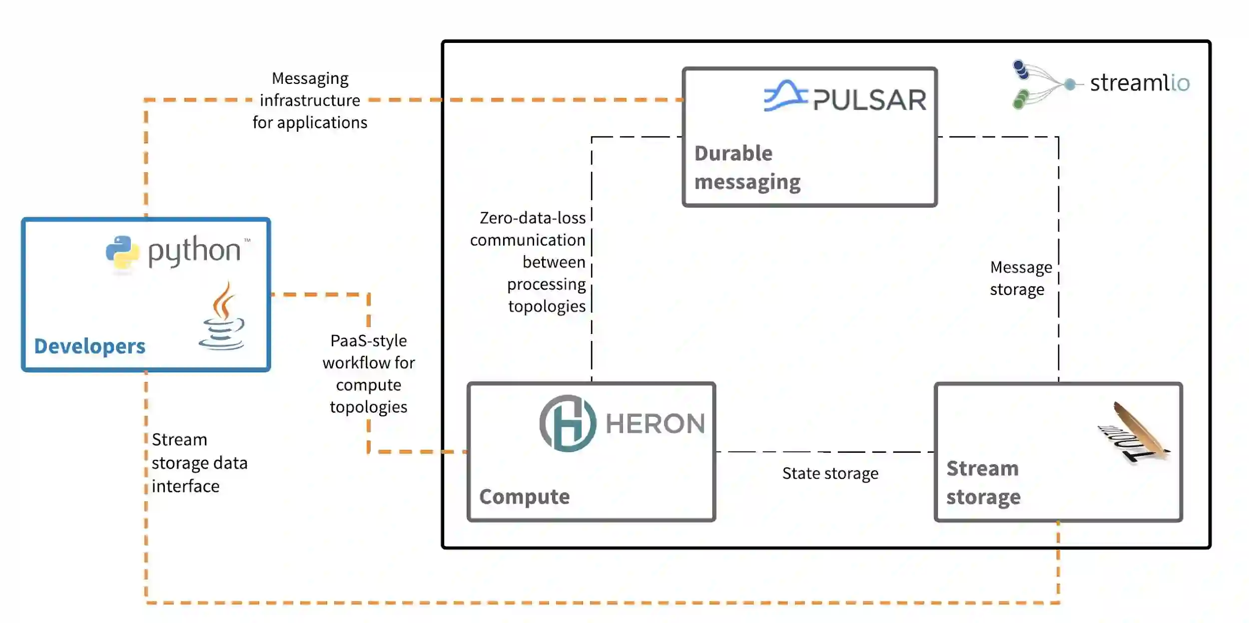 Streamlio 实时处理平台由三个核心系统(Heron、Pulsar 和 BookKeeper)组成,其中 Heron 提供实时计算(compute),Pulsar 提供持久化的消息系统(messaging),BookKeeper 提供流存储(stream storage)。Streamlio 团队提供了一系列的技术文章来详细阐述平台的各个组成部分的特性:Heron(https://www.streaml.io/blog/why-heron),Pulsar(https://www.streaml.io/blog/why-apache-pulsar)和 BookKeeper(https://www.streaml.io/blog/intro-to-bookkeeper)。