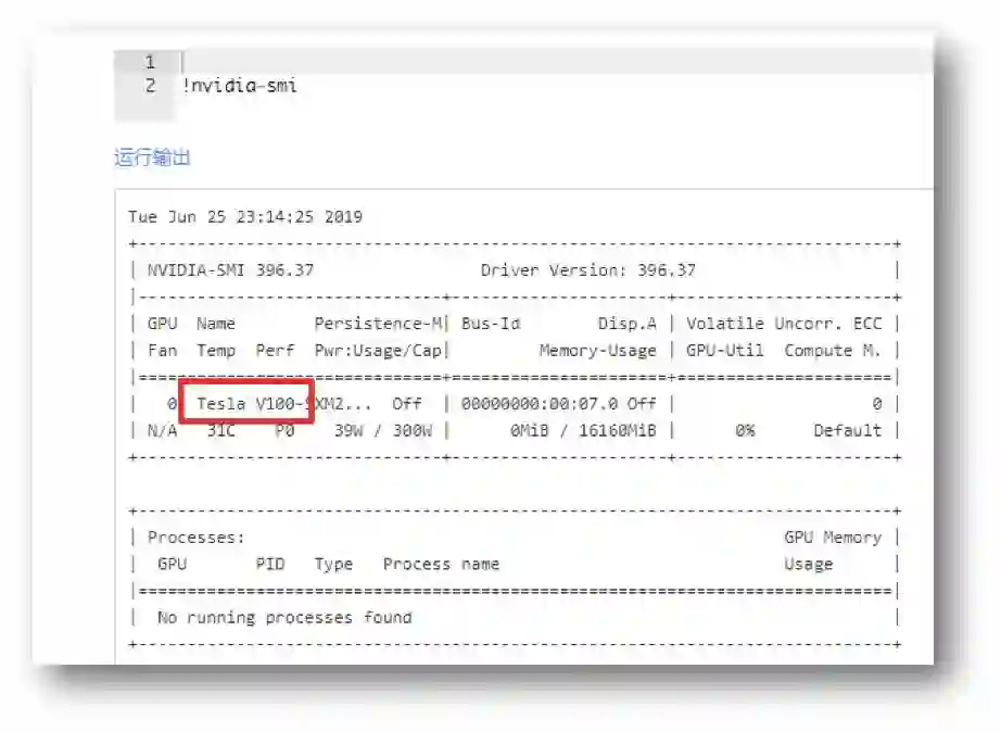 6、此时可以进行校验:使用代码查看环境, 确定使用的是的英伟达Tesla V100显卡。就可以放心开始进行项目了。