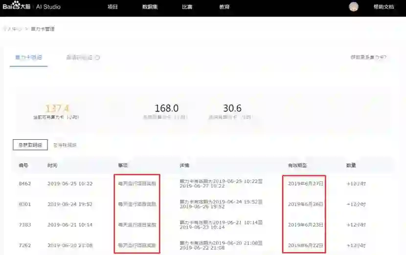 自6月20日起,每日在百度大脑AI Studio上运行其平台内单机项目, 即可每日获得12小时的算力支持. 操作步骤如下: