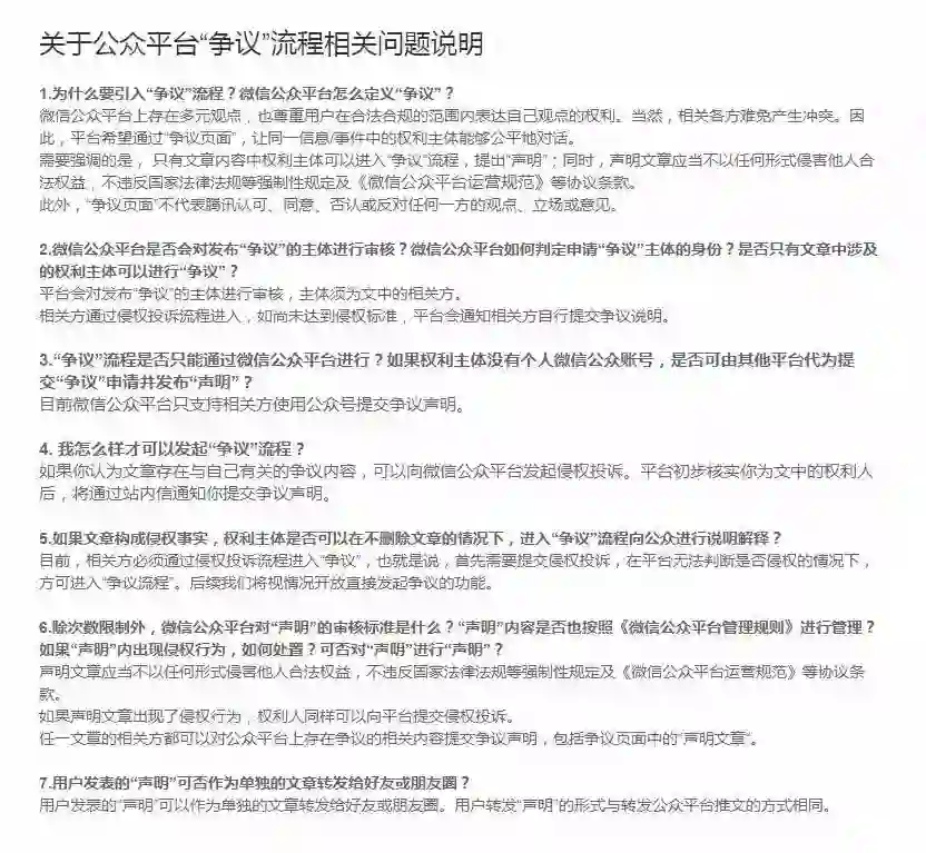 在腾讯客服官网,榜妹也发现了一份《关于公众平台“争议”流程相关问题说明》(如下,点击可查看大图)。据榜妹求证,“争议”功能今晚9点多已正式上线。