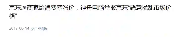 在今年6.18年中大促预热期间,“天下网商”在微信公号上转载微博网友的爆料,发布了题为《京东逼商家给消费者涨价,神舟电脑举报京东“恶意扰乱市场价格”》的文章。