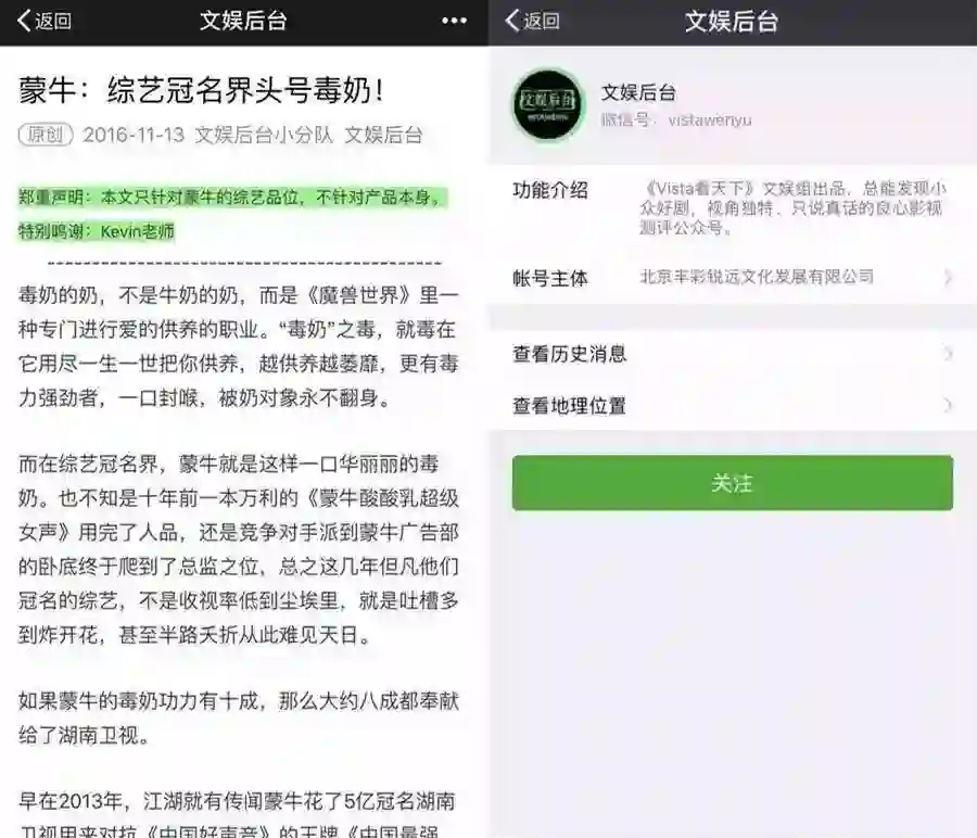 目前,在“文娱后台”的历史消息中仍可打开这篇《蒙牛:综艺冠名界头号毒奶》,该文章开头附有“郑重声明”称:本文只针对蒙牛的综艺品味,不针对产品本身。