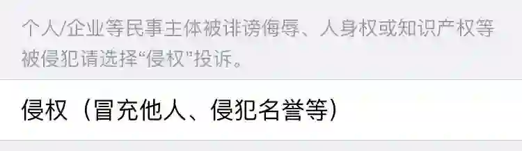 在微信文章投诉页面有一项为“侵权(冒充他人、侵犯名誉等)”,是企业或个人在被公众号文章诽谤侮辱、人身权或知识产权等被侵权时的投诉通道。