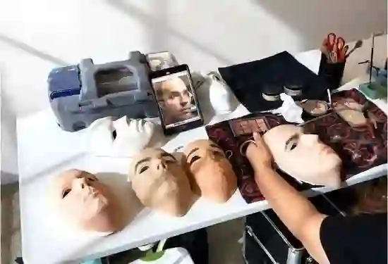 团队面临的下一个挑战是选择什么材料来制作面部皮肤。理想的材料首先要有足够的硬度,能够准确复刻皮尔斯的面部形状和棱角而不能变形,同时还得足够柔软,好让红外摄像机误以为这是人类皮肤。卡拉根使用不同材料做出五副面具:有弹性且半透明的硅酮、不透明的柔软乙烯、明胶、坚硬的石膏还有轻薄但坚硬的塑料。