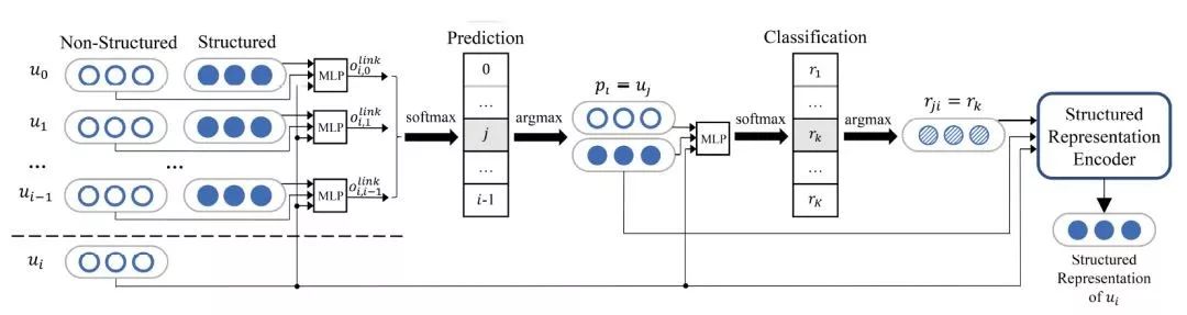 前两篇论文均由同一单位提出,特点是采用了基于最大熵的人工构造特征的方法,并分别采用MST和ILP进行解码。与前人工作不同,清华大学黄民烈老师团队于AAAI 2019发表了基于深度序列模型的多人对话语篇解析模型[6],模型结构如图2所示。该模型的创新性主要在于三方面:首先,采用了深度神经网络自动学习特征,摒弃了人工构建特征的方法;其次,该模型在确定EDU父节点的同时学习到了包含路径信息的结构化表示,例如图1中的;最后,作者首先引入了讲者信息。
