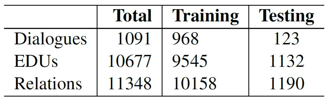 表1中列出了STAC语料的数据概况。从表1中我们可以看出该数据集中有10,677个EDU和11,348个关系实例,STAC数据集中的EDU通常为玩家发送的一条消息,或消息中的一个句子。表1还说明EDU之间的篇章语义关系相对稀疏,平均每个EDU仅有1.06个关系。