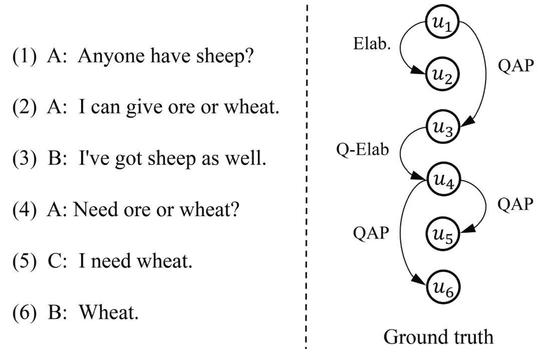图1中显示了STAC中的一个对话实例。图1的左侧为原始的多人对话文本,其中包括A、B、C共3名参与者。图1的右侧显示了对该对话进行语篇解析后的标准标注结果,其中的代表(1)~(6)的6条消息,每条消息作为一个基本语义单元(EDU),在输出的有向图中作为一个顶点。图中的有向边代表了篇章语义关系,例如