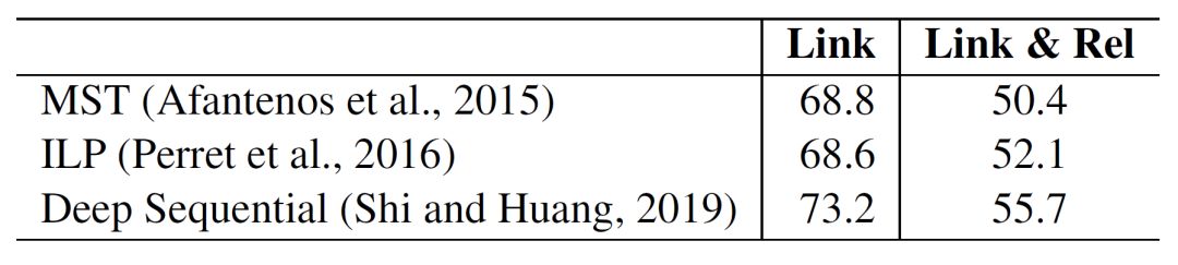 STAC数据集上现有模型的F1值结果如表3所示(更多基线结果可查看[4][5][6])。表中的Link代表边预测任务,即判断2个EDU之间是否存在篇章语义关系,是一个二分类任务;而Link & Rel 代表预测边和关系,在预测边的基础上,还需要进行16-分类的篇章语义关系分类以确定具体的语义关系类型。从表3我们可以发现,融合结构化表示和讲者信息的深度序列模型效果明显优于基于MST和ILP的方法,且省去了人工设计特征的工作。