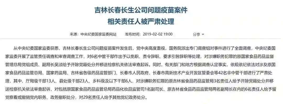 1.吉林长春长生公司问题疫苗案件相关责任人被严肃处理