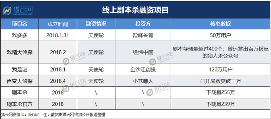 上述融资只是该领域已经披露的融资消息。据猎云网了解,还有部分融资情况未被披露。截至目前,虽还未有游戏巨头入局,但有曾布局线上狼人杀的创业者开始把眼光放到这一领域。研发出天天狼人杀的沈阳美嘉信息科技有限公司也推出了剧本杀app。此外,玩吧的母公司北京默契破冰科技有限公司早在年初就上线了同类app,另有传言陌陌也将入局,具体形式还未透露。