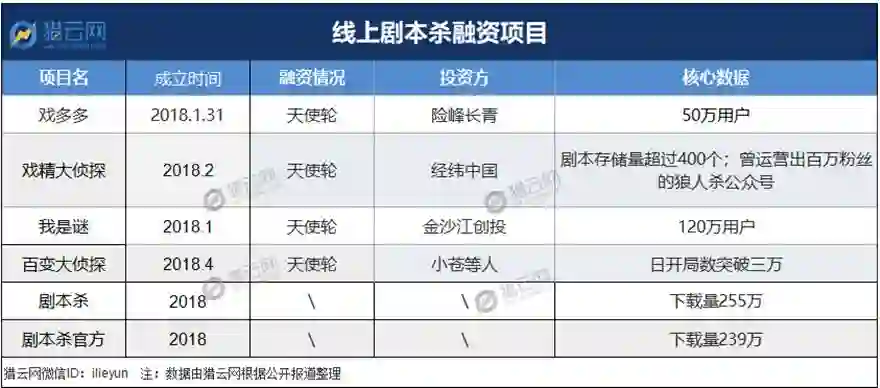 今年4月,戏多多获数百万元天使轮融资,投资方为险峰长青。5月,戏精大侦探获得经纬中国数百万元天使轮融资;7月,我是谜获得金沙江创投数百万元的天使轮投资;10月,百变大侦探获得电竞女神小苍等人数百万元天使轮投资......