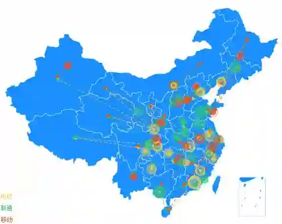 如下图所示,不同颜色的圆圈代表不同的运营商,节点覆盖了页面数量大的区域。